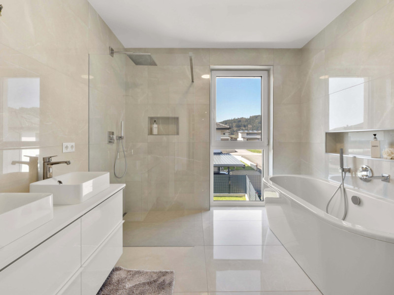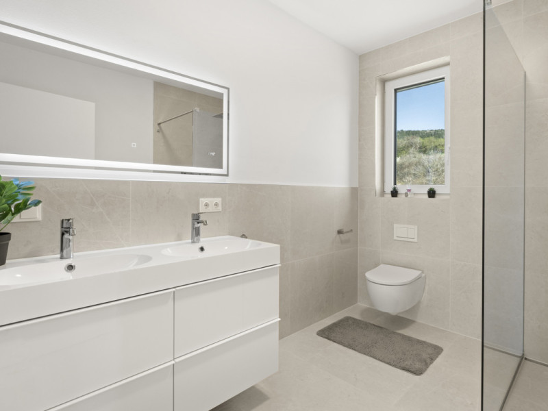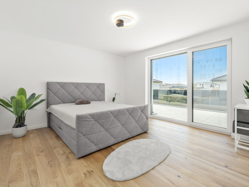Das Erdgeschoss besticht durch seine geschickte Aufteilung, inklusive einem Vorraum bzw. Garderobenplatz, einem Technikraum und Hauswirtschaftsraum, einem Badezimmer sowie einem großzügigen Wohn- und Essbereich. Ein geräumiges Schlafzimmer und eine moderne Küche komplettieren diesen Bereich.