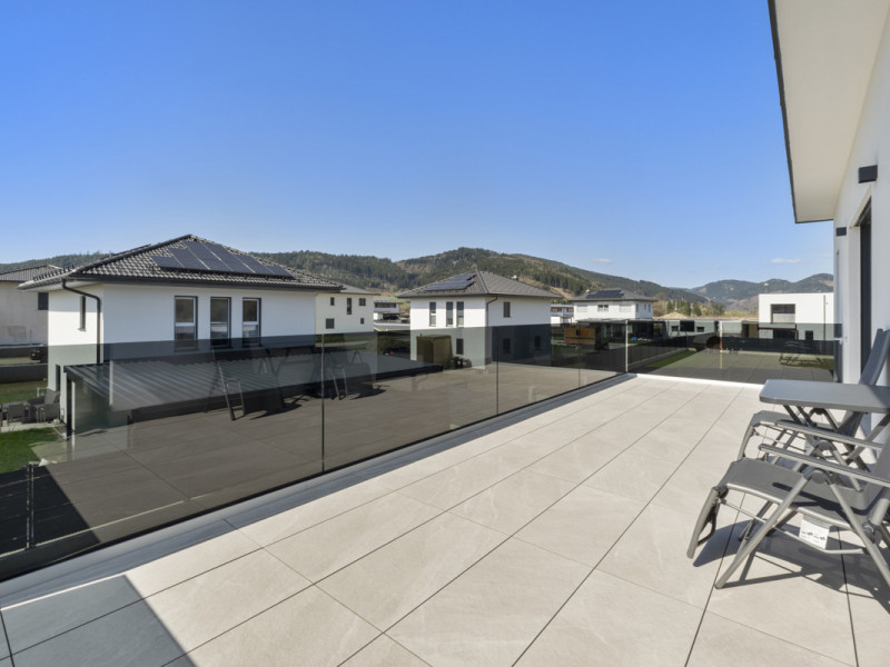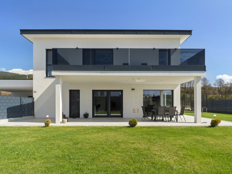 Die Liegenschaft beeindruckt mit einer großzügigen Einfahrt und zwei weitläufigen Terrassen, die zum Verweilen im Freien einladen. Hinter dem Carport verbirgt sich ein praktischer Abstellraum für zusätzlichen Stauraum.